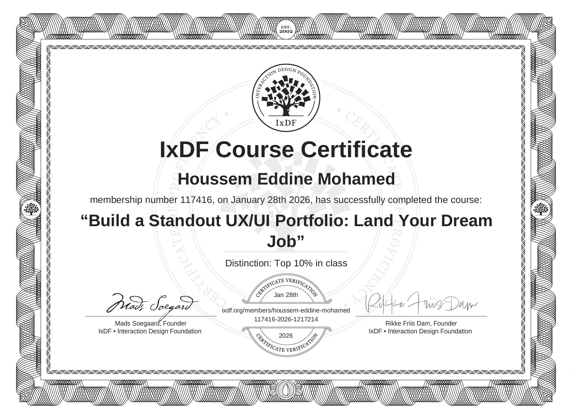 This IxDF Membership Certificate is issued to Houssem Eddine Mohamed