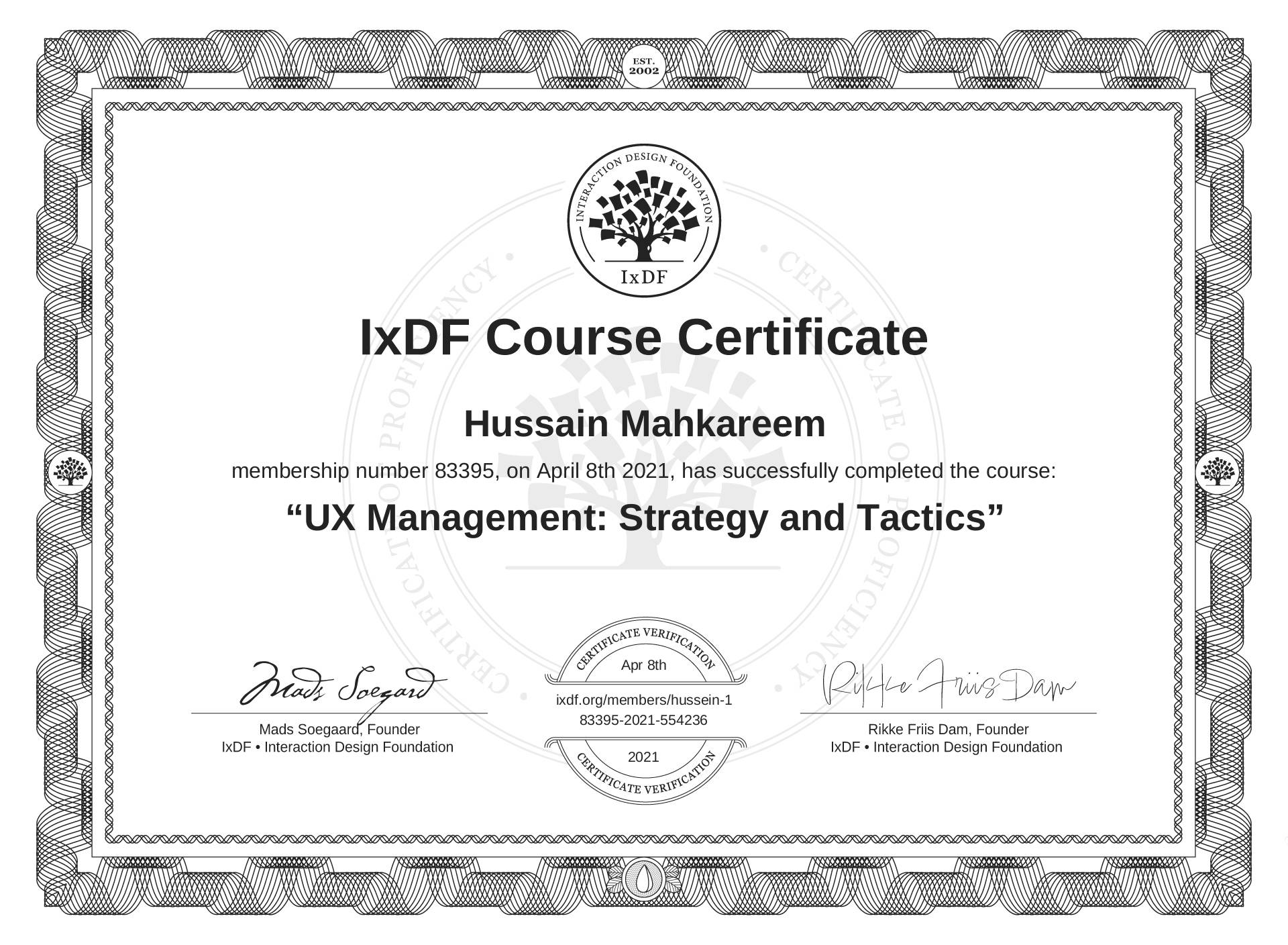 IxDF Course Certificate awarded to Hussain Mahkareem for completing the "UX Management: Strategy and Tactics" course