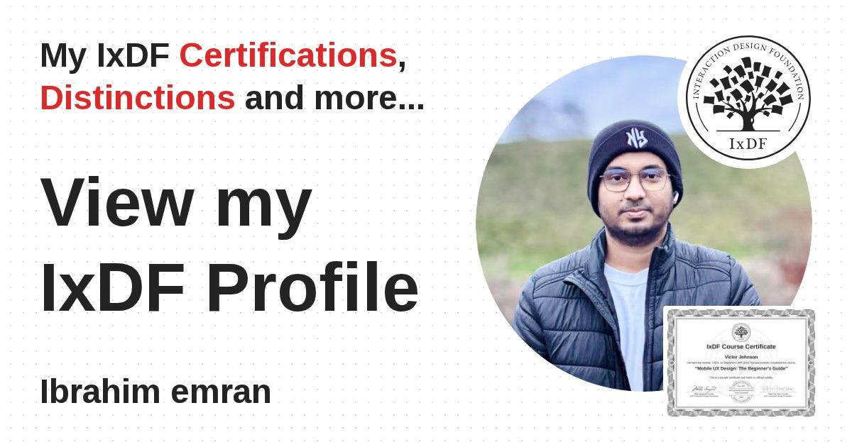 IxDF Course Certificates are awarded to Ibrahim emran in formal recognition of their coursework surpassing the rigorous benchmarks of exceptional performance established by the IxDF Educational Codex.