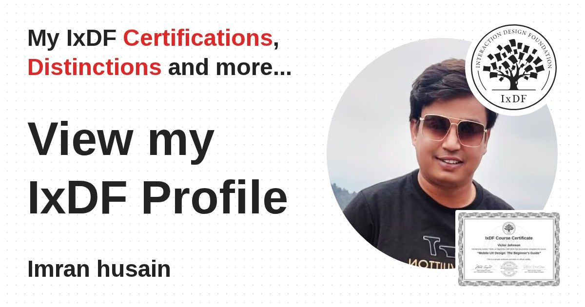 IxDF Course Certificates are awarded to Imran husain in formal recognition of their coursework surpassing the rigorous benchmarks of exceptional performance established by the IxDF Educational Codex.