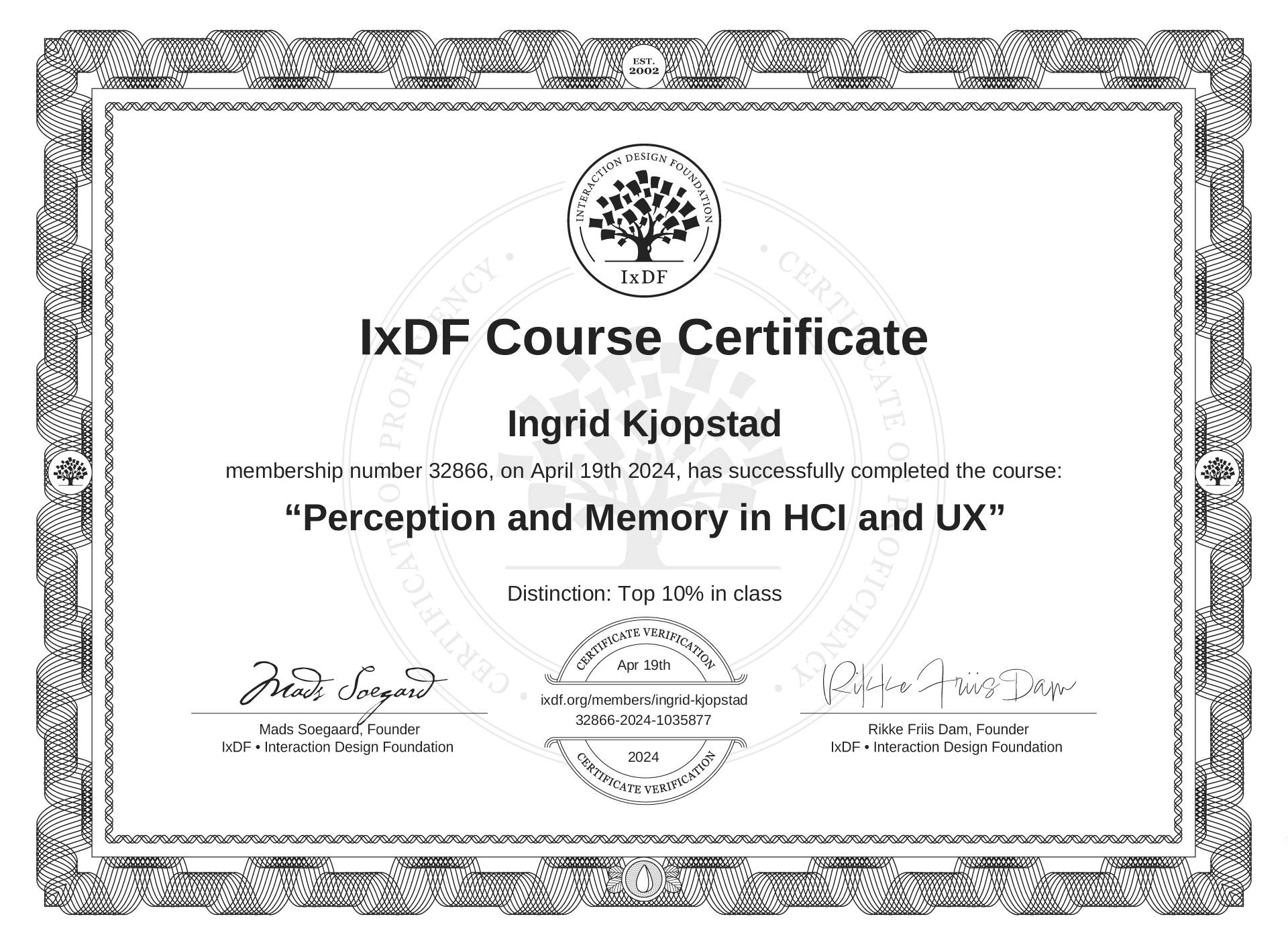 This IxDF Membership Certificate is issued to Ingrid Kjøpstad