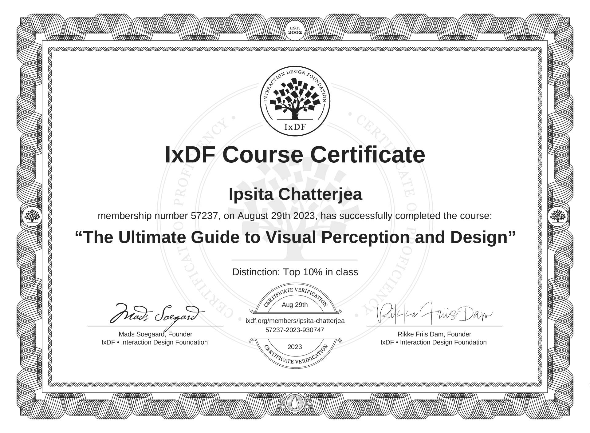 IxDF Course Certificates are awarded to Ipsita Chatterjea in formal recognition of their coursework surpassing the rigorous benchmarks of exceptional performance established by the IxDF Educational Codex.