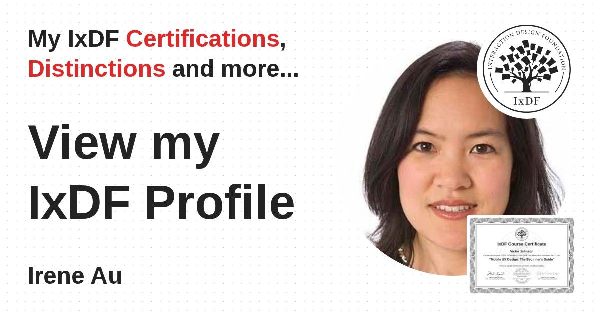 This IxDF Membership Certificate is issued to Irene Au in formal recognition of their membership of the IxDF, global leader in design education.
