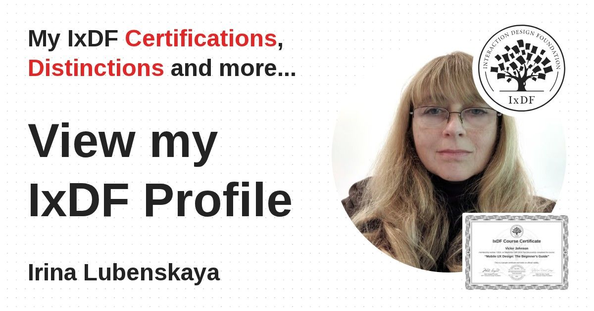 IxDF Course Certificates are awarded to Irina Lubenskaya in formal recognition of their coursework surpassing the rigorous benchmarks of exceptional performance established by the IxDF Educational Codex.