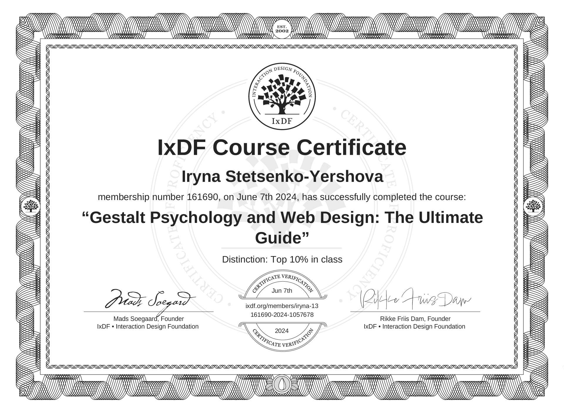 IxDF Course Certificate awarded to Iryna Stetsenko-Yershova for completing the "Gestalt Psychology and Web Design: The Ultimate Guide" course