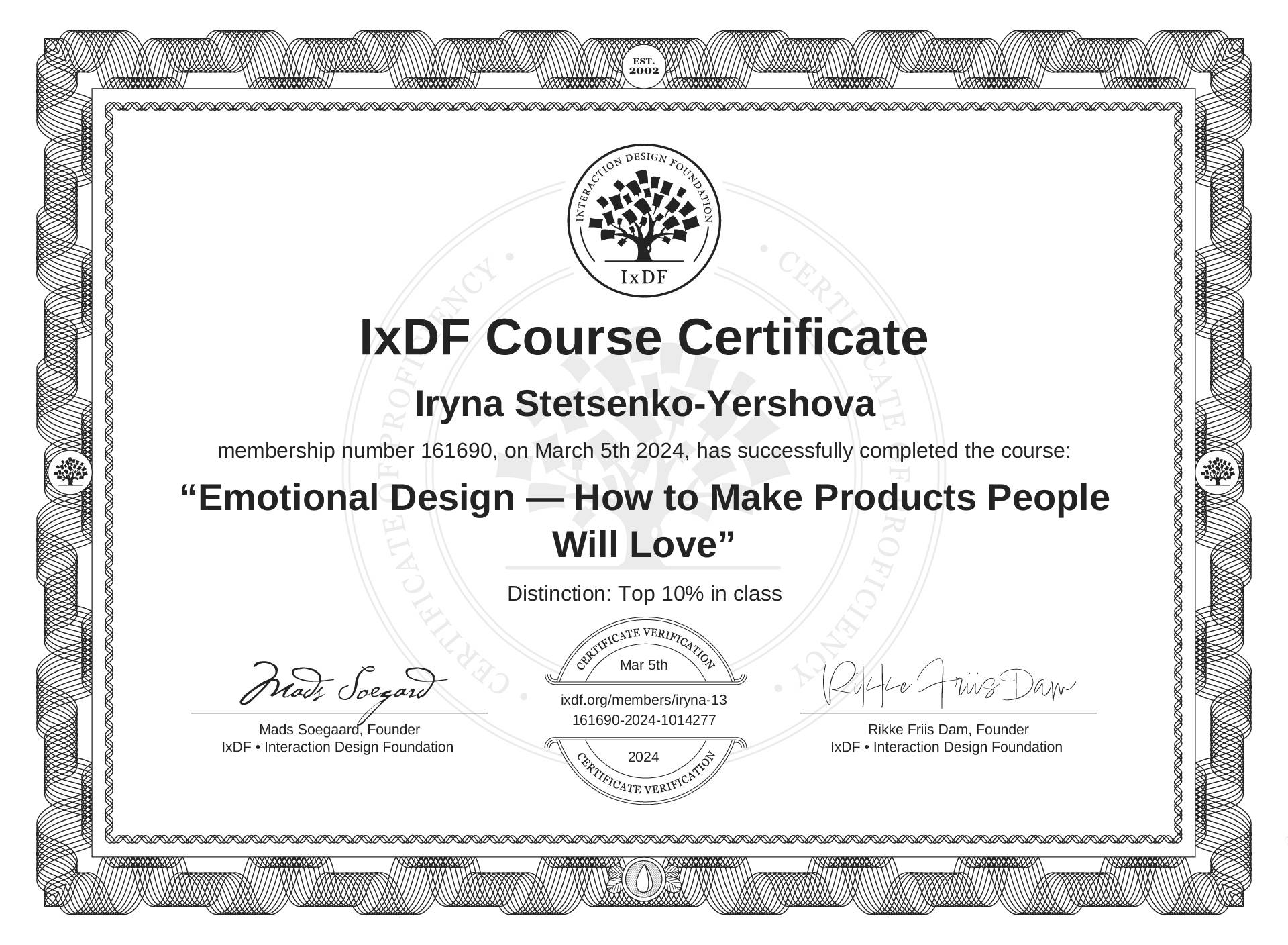 Iryna Stetsenko-Yershova's Course Certificate: Emotional Design — How to Make Products People Will Love