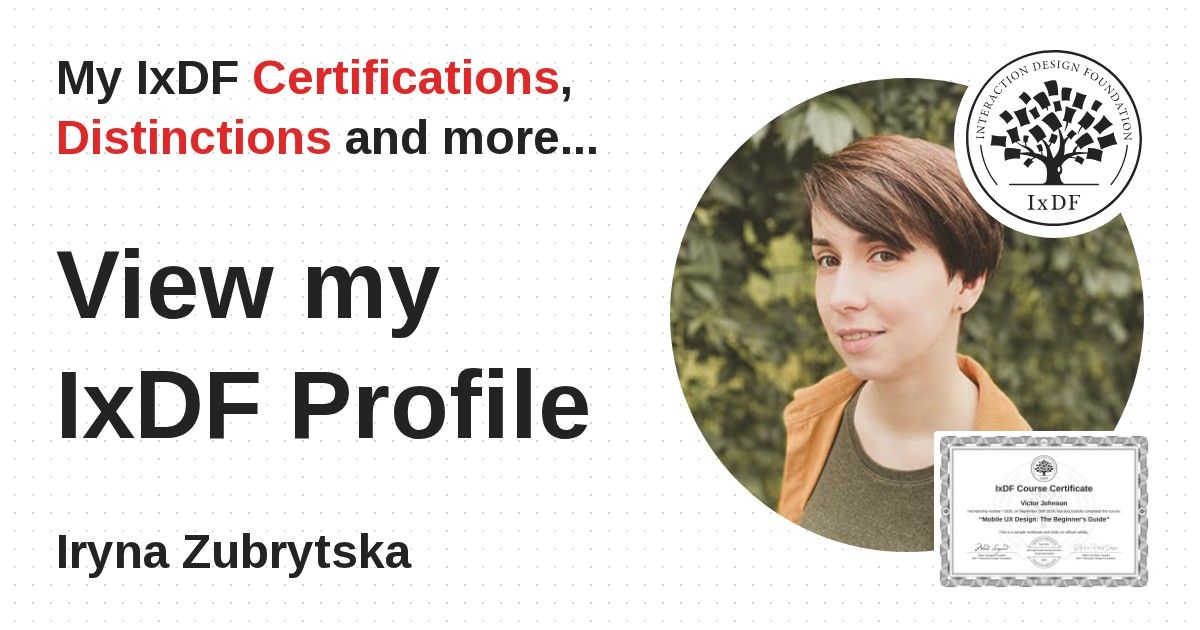 IxDF Course Certificates are awarded to Iryna Zubrytska in formal recognition of their coursework surpassing the rigorous benchmarks of exceptional performance established by the IxDF Educational Codex.