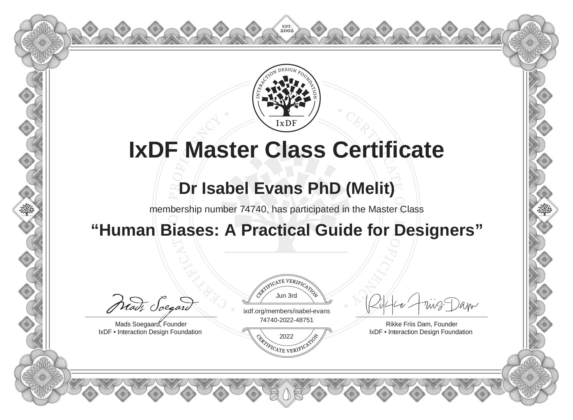 The IxDF Master Class Certificate (ID #mcc_4fb94bc627124553bd605ffe8508bc8f) above is awarded to Dr Isabel Evans PhD (Melit)