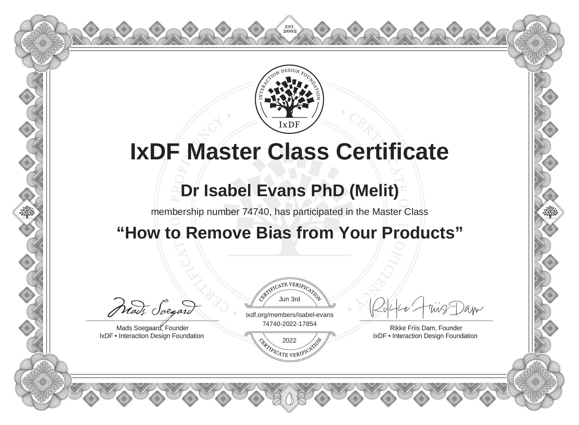 IxDF Master Class Certificates are awarded to Dr Isabel Evans PhD (Melit) in formal recognition of their attendance and ongoing commitment to learning from industry leaders.