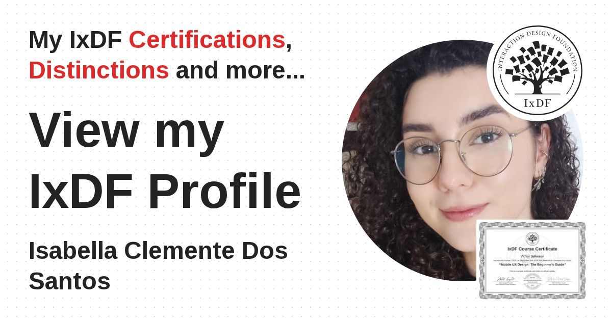 IxDF Course Certificates are awarded to Isabella Clemente Dos Santos in formal recognition of their coursework surpassing the rigorous benchmarks of exceptional performance established by the IxDF Educational Codex.