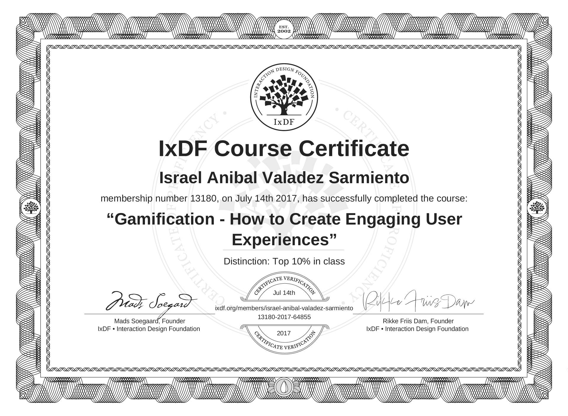This IxDF Membership Certificate is issued to Israel Anibal Valadez Sarmiento