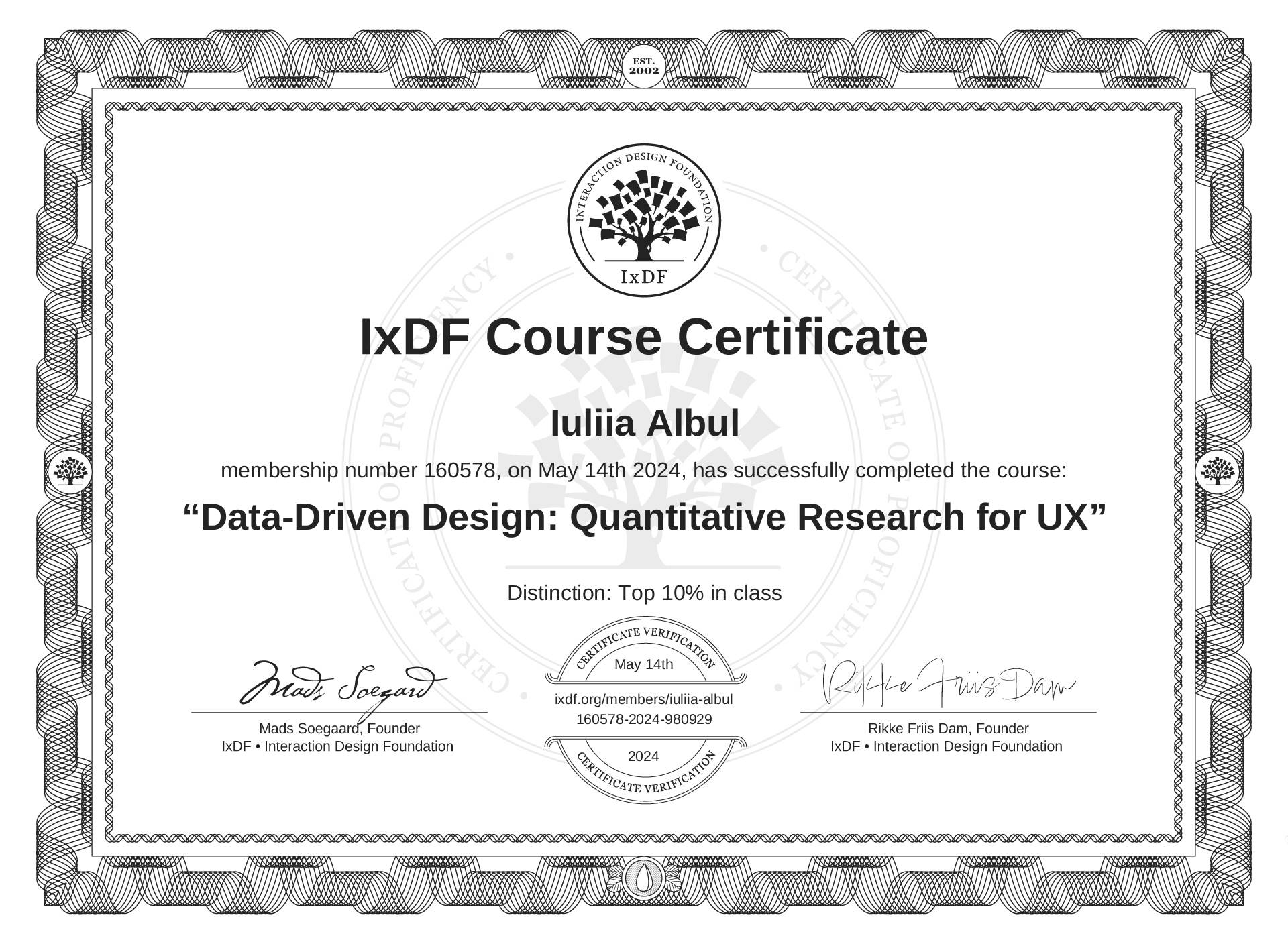 The IxDF Course Certificate (ID #0c2ff2d5-67aa-456a-bd55-22f3640325b7) above is awarded to Iuliia Albul