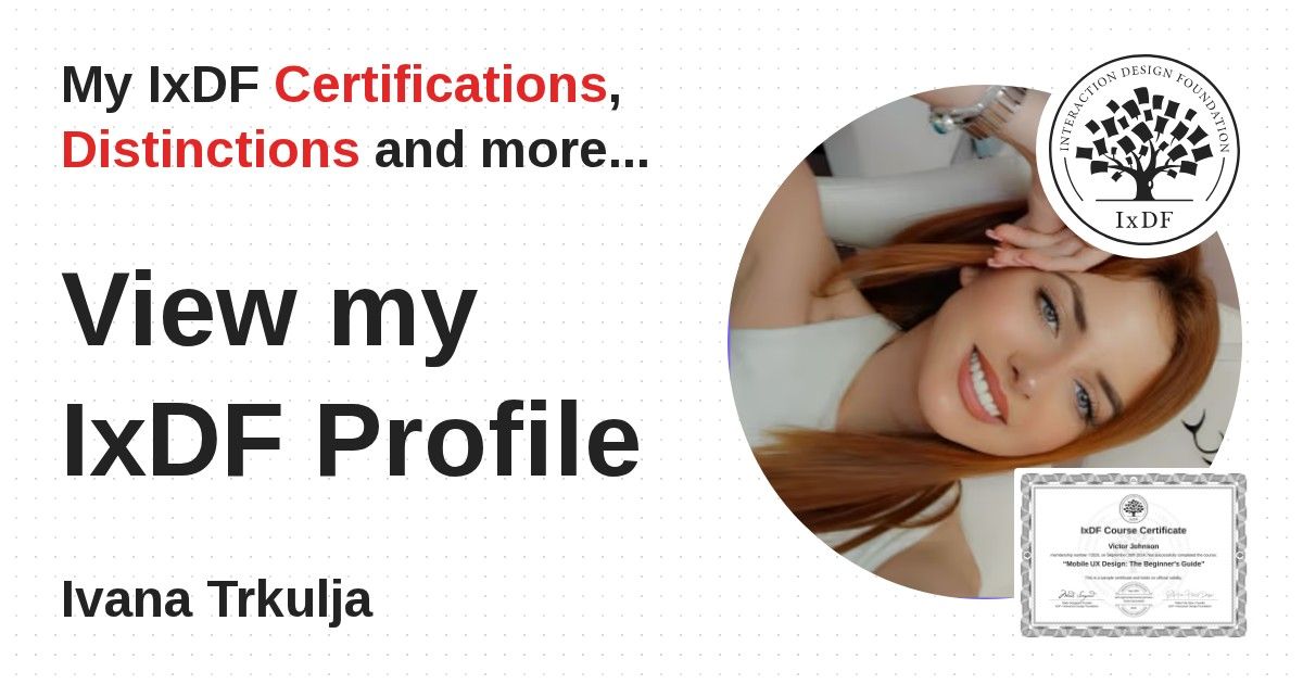 IxDF Course Certificates are awarded to Ivana Trkulja in formal recognition of their coursework surpassing the rigorous benchmarks of exceptional performance established by the IxDF Educational Codex.