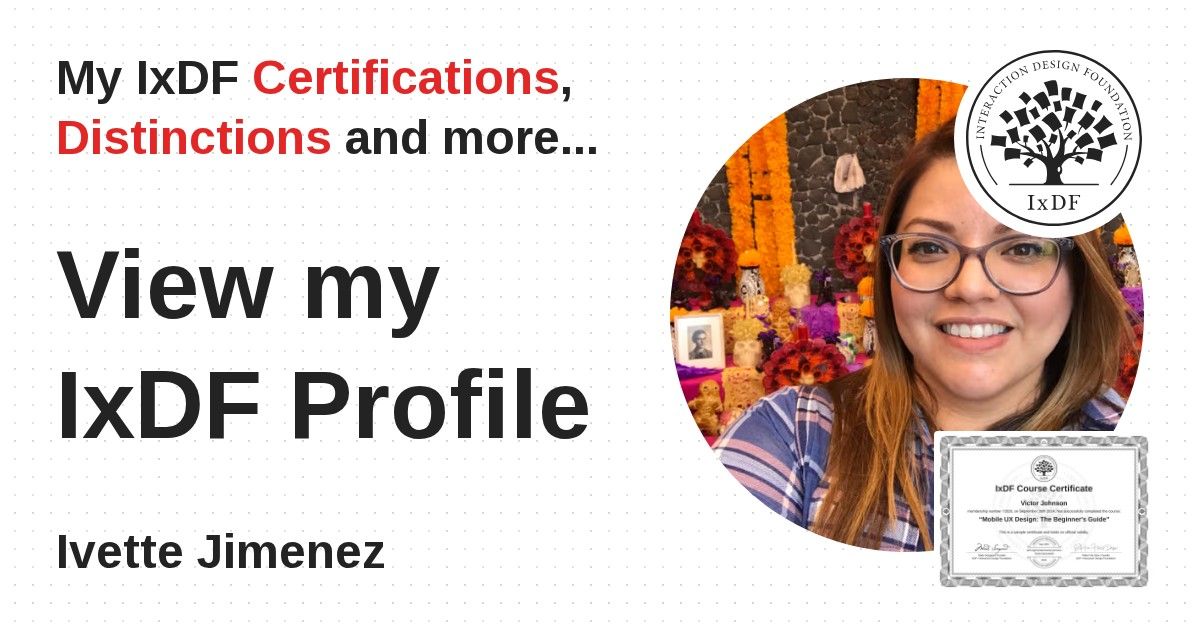 IxDF Course Certificates are awarded to Ivette Jimenez in formal recognition of their coursework surpassing the rigorous benchmarks of exceptional performance established by the IxDF Educational Codex.
