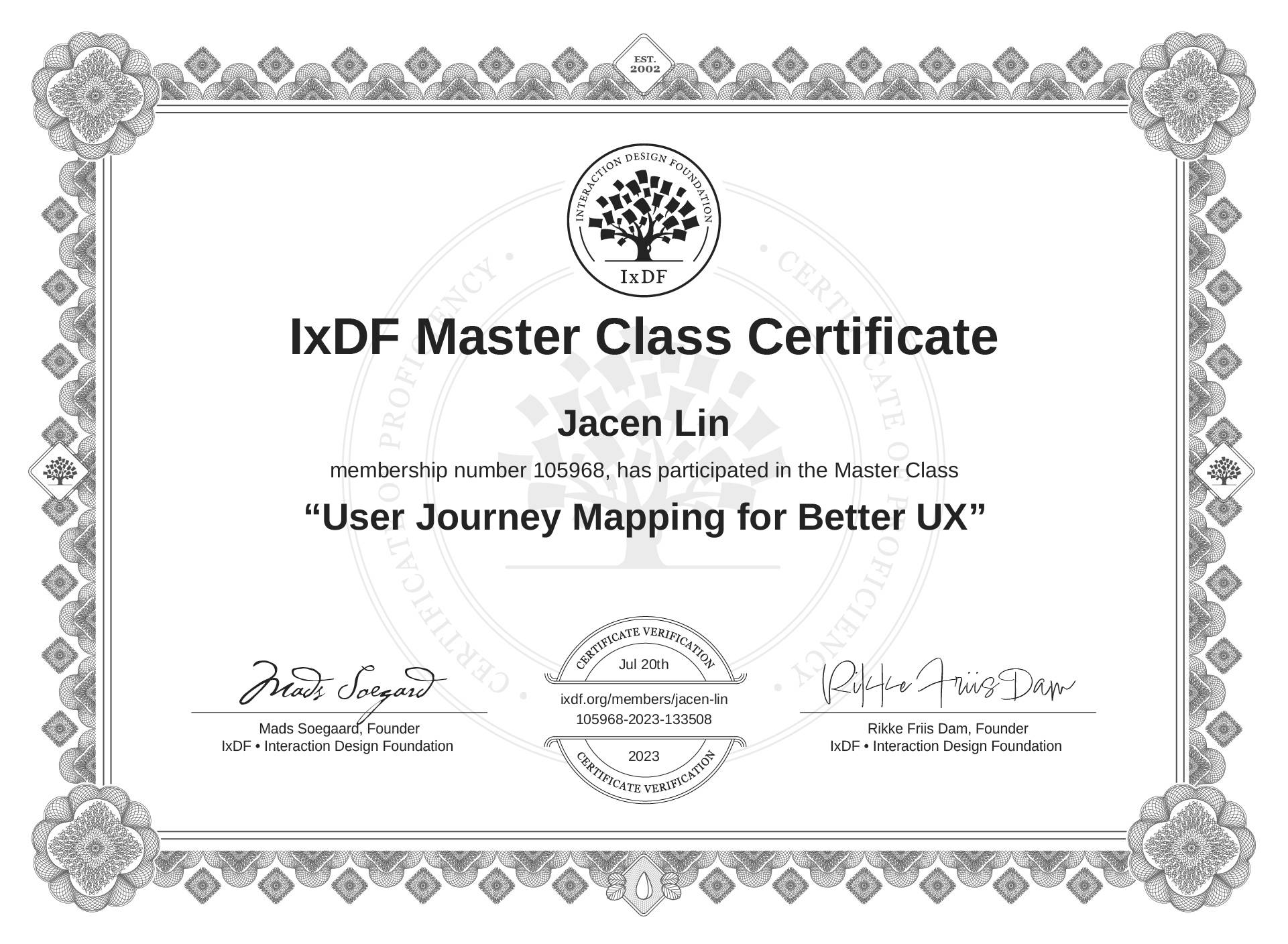 IxDF Master Class Certificates are awarded to Jacen Lin in formal recognition of their attendance and ongoing commitment to learning from industry leaders.