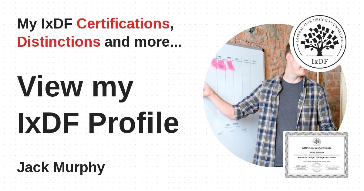 IxDF Course Certificates are awarded to Jack Murphy in formal recognition of their coursework surpassing the rigorous benchmarks of exceptional performance established by the IxDF Educational Codex.