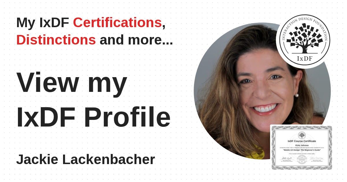 IxDF Course Certificates are awarded to Jackie Lackenbacher in formal recognition of their coursework surpassing the rigorous benchmarks of exceptional performance established by the IxDF Educational Codex.