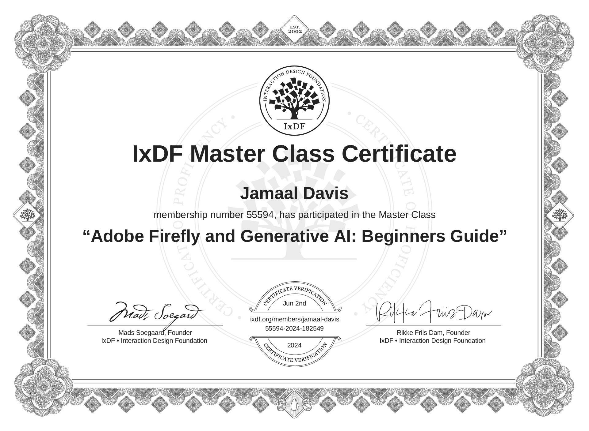 IxDF Master Class Certificates are awarded to Jamaal Davis in formal recognition of their attendance and ongoing commitment to learning from industry leaders.