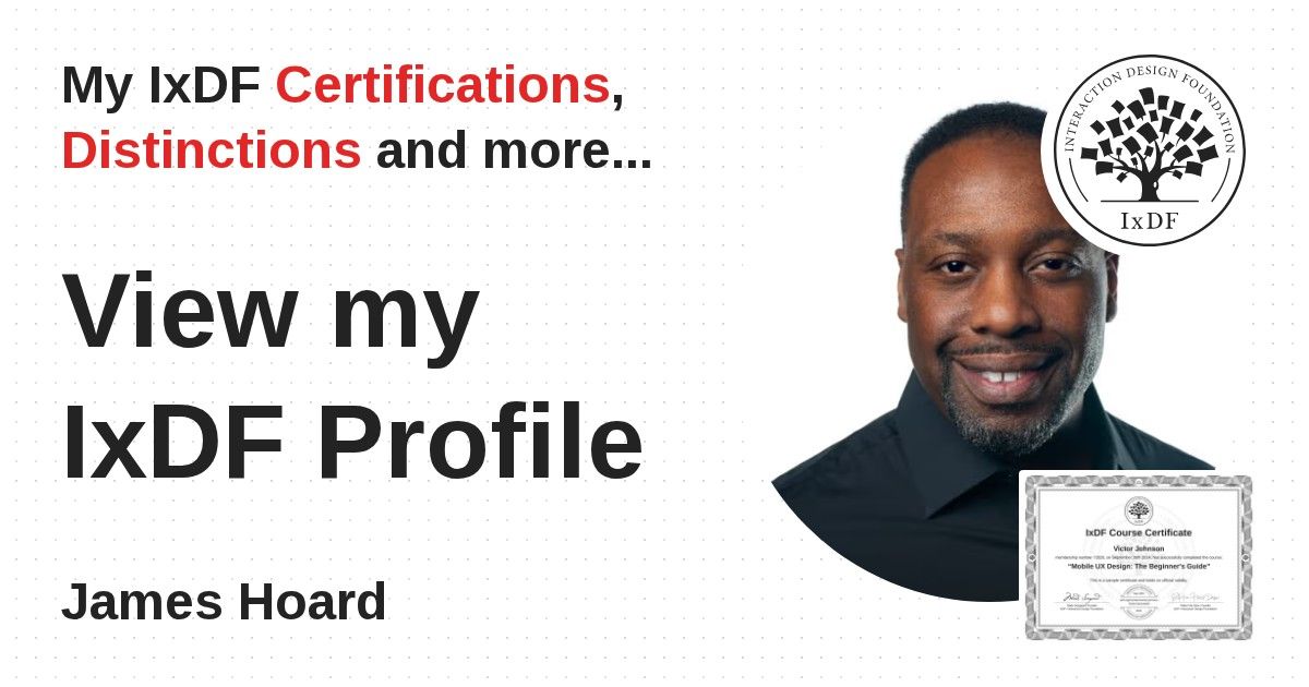 IxDF Course Certificates are awarded to James Hoard in formal recognition of their coursework surpassing the rigorous benchmarks of exceptional performance established by the IxDF Educational Codex.