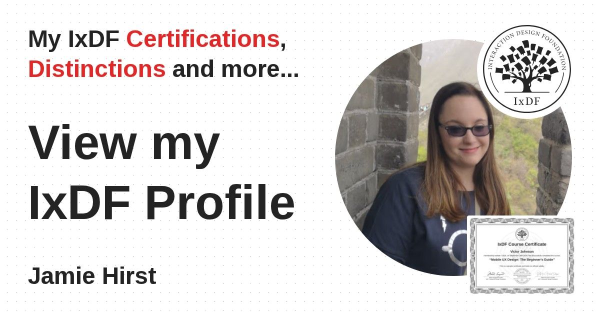 IxDF Course Certificates are awarded to Jamie Hirst in formal recognition of their coursework surpassing the rigorous benchmarks of exceptional performance established by the IxDF Educational Codex.