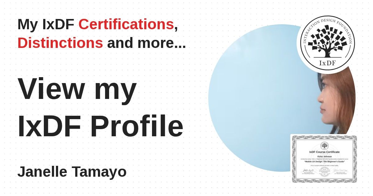 IxDF Course Certificates are awarded to Janelle Tamayo in formal recognition of their coursework surpassing the rigorous benchmarks of exceptional performance established by the IxDF Educational Codex.