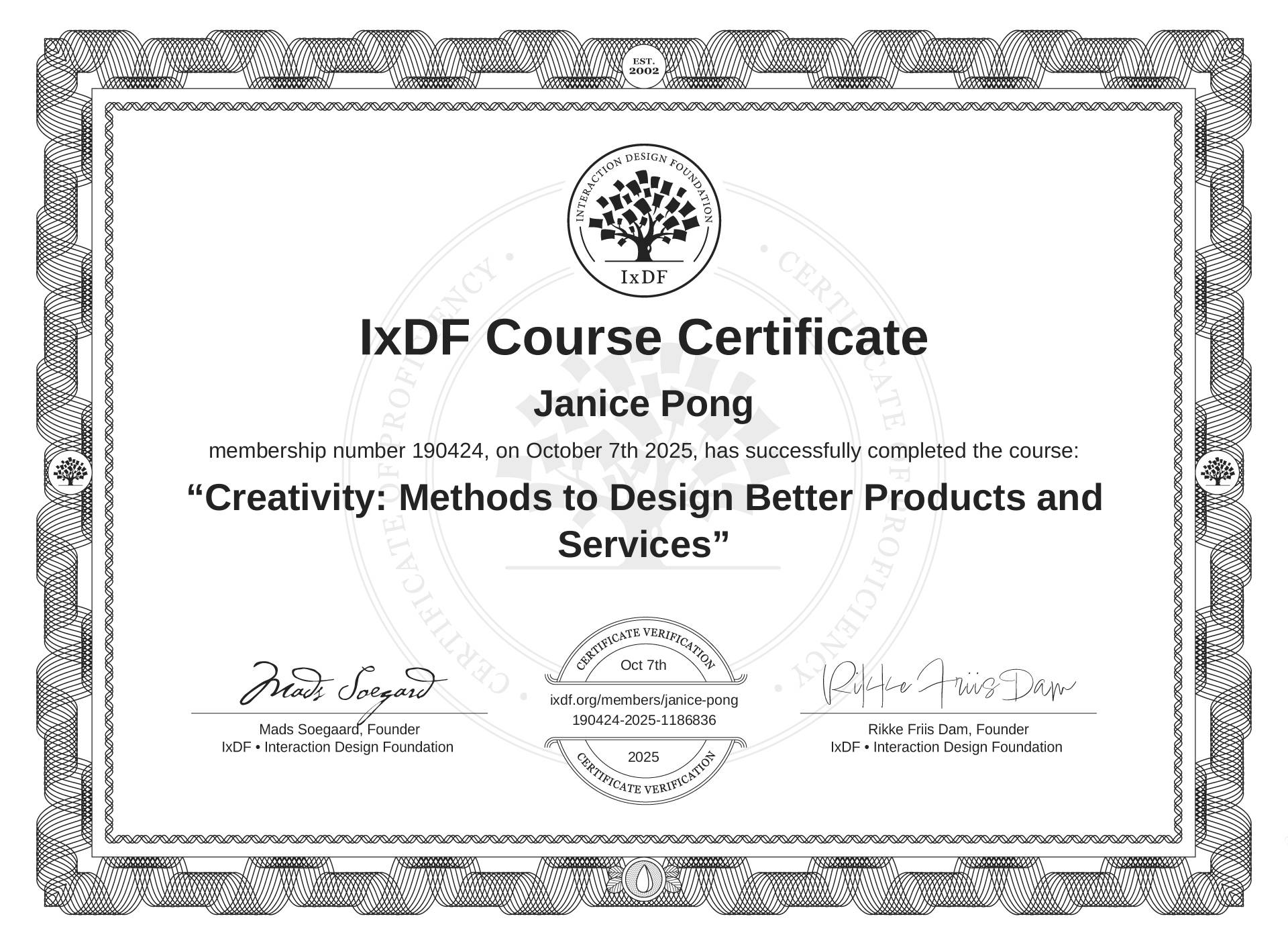 IxDF Course Certificate awarded to Janice Pong for completing the "Creativity: Methods to Design Better Products and Services" course
