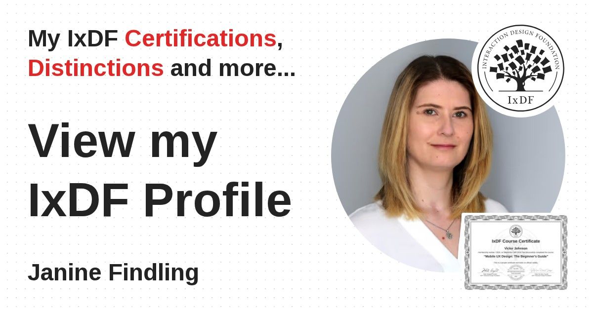 IxDF Course Certificates are awarded to Janine Findling in formal recognition of their coursework surpassing the rigorous benchmarks of exceptional performance established by the IxDF Educational Codex.