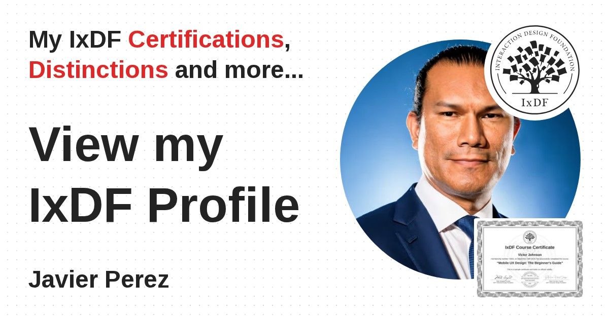 IxDF Course Certificates are awarded to Javier Perez in formal recognition of their coursework surpassing the rigorous benchmarks of exceptional performance established by the IxDF Educational Codex.