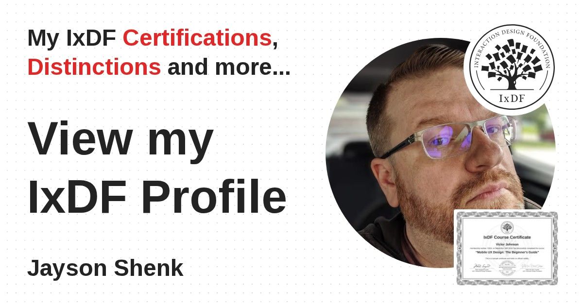 IxDF Course Certificates are awarded to Jayson Shenk in formal recognition of their coursework surpassing the rigorous benchmarks of exceptional performance established by the IxDF Educational Codex.