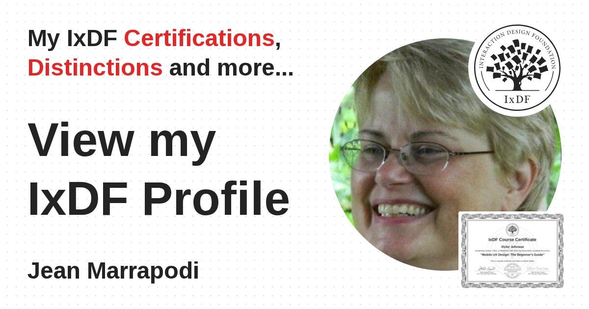 IxDF Course Certificates are awarded to Jean Marrapodi in formal recognition of their coursework surpassing the rigorous benchmarks of exceptional performance established by the IxDF Educational Codex.