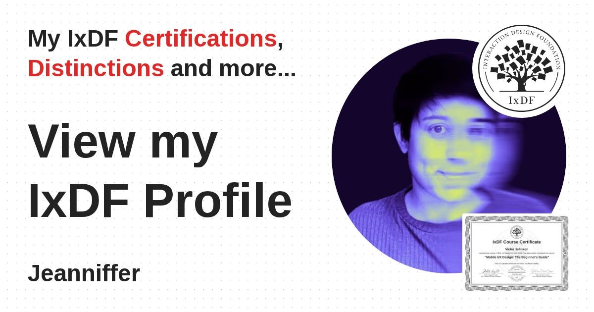 IxDF Course Certificates are awarded to Jeanniffer in formal recognition of their coursework surpassing the rigorous benchmarks of exceptional performance established by the IxDF Educational Codex.