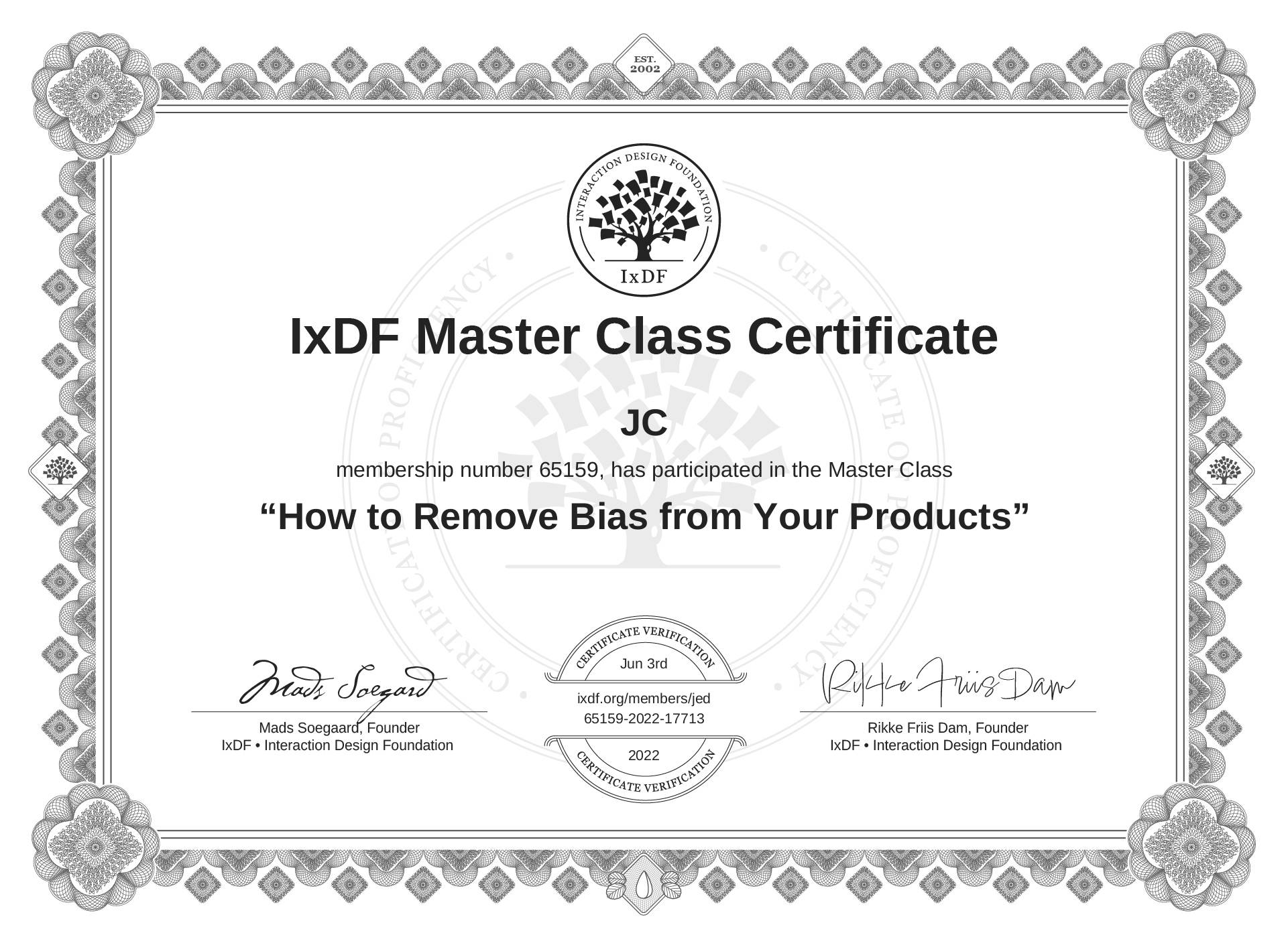 The IxDF Master Class Certificate (ID #mcc_a97d38ee054f4e648f652ab919121249) above is awarded to JC in formal recognition of their participation in the Master Class How to Remove Bias from Your Products .