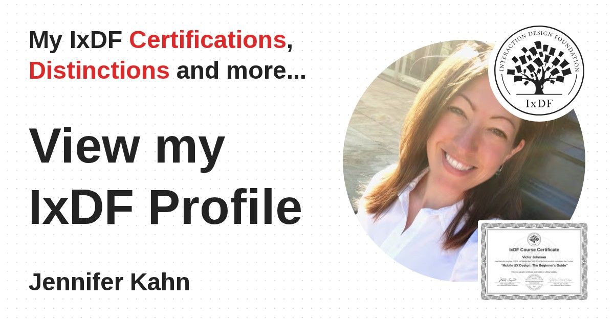 IxDF Course Certificates are awarded to Jennifer Kahn in formal recognition of their coursework surpassing the rigorous benchmarks of exceptional performance established by the IxDF Educational Codex.