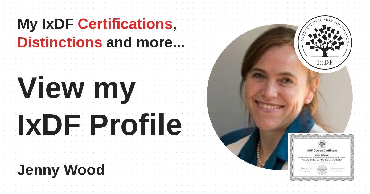 IxDF Course Certificates are awarded to Jenny Wood in formal recognition of their coursework surpassing the rigorous benchmarks of exceptional performance established by the IxDF Educational Codex.