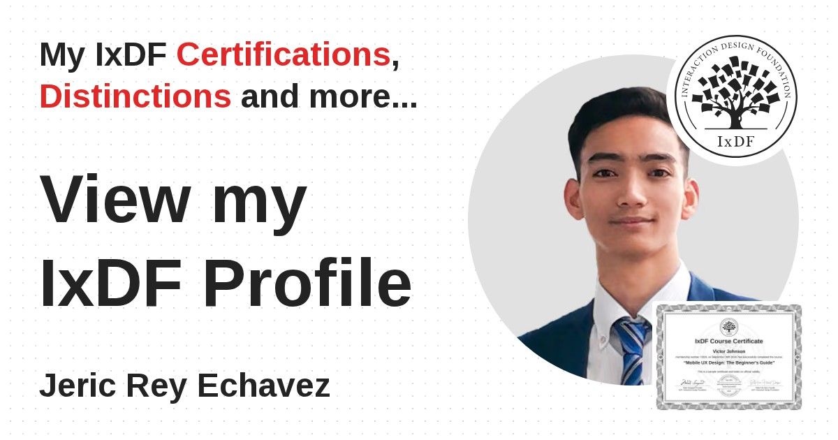 IxDF Course Certificates are awarded to Jeric Rey Echavez in formal recognition of their coursework surpassing the rigorous benchmarks of exceptional performance established by the IxDF Educational Codex.