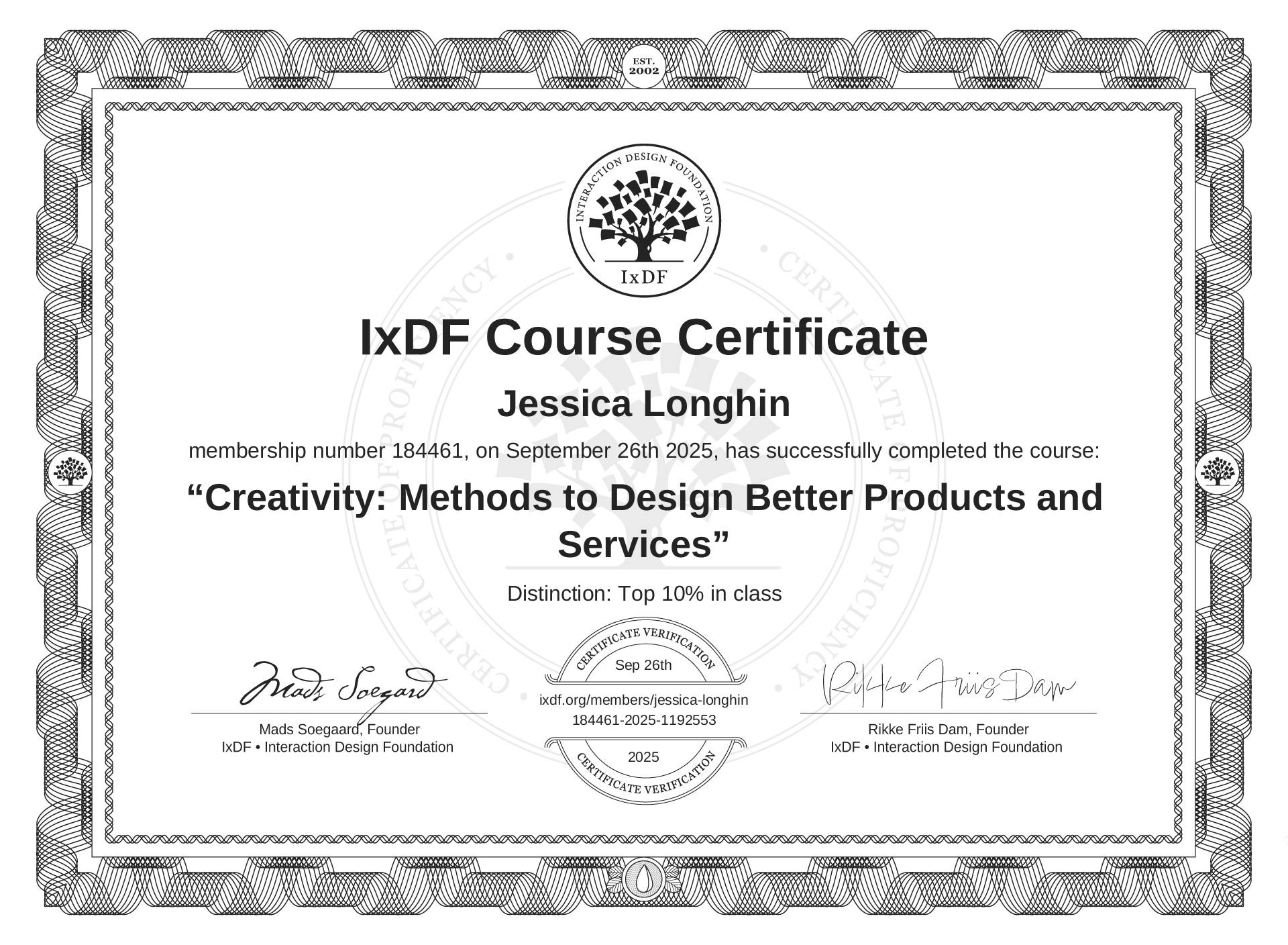The IxDF Course Certificate (ID #47fb2660-238d-4b3f-82d8-7aa6b6e86a5d) above is awarded to Jessica Longhin with a Top 10% Distinction in formal recognition of their coursework surpassing the rigorous benchmarks of exceptional performance established by the IxDF Educational Codex. View Course Curriculum.