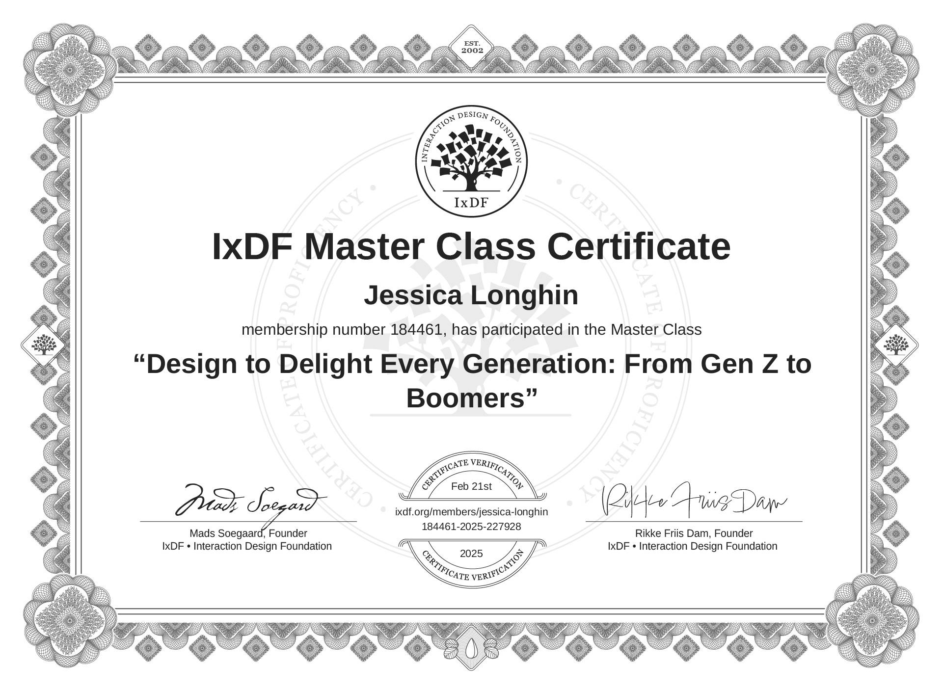The IxDF Master Class Certificate (ID #mcc_0c651566db15426bafd377c57e66e002) above is awarded to Jessica Longhin in formal recognition of their participation in the Master Class Design to Delight Every Generation: From Gen Z to Boomers .