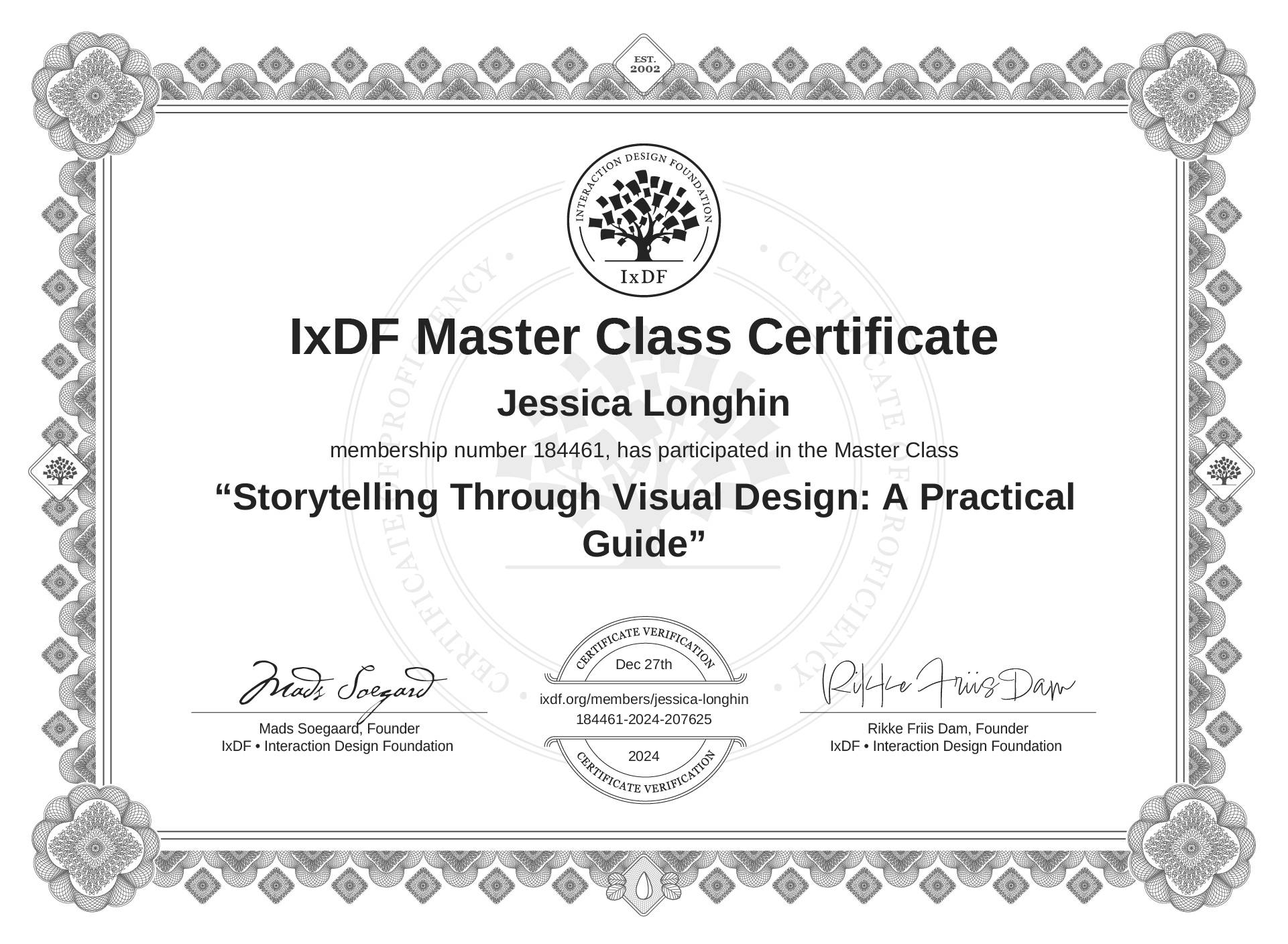 The IxDF Master Class Certificate (ID #mcc_1ac9ff0f306c4178b5f8455781a13177) above is awarded to Jessica Longhin in formal recognition of their participation in the Master Class Storytelling Through Visual Design: A Practical Guide .