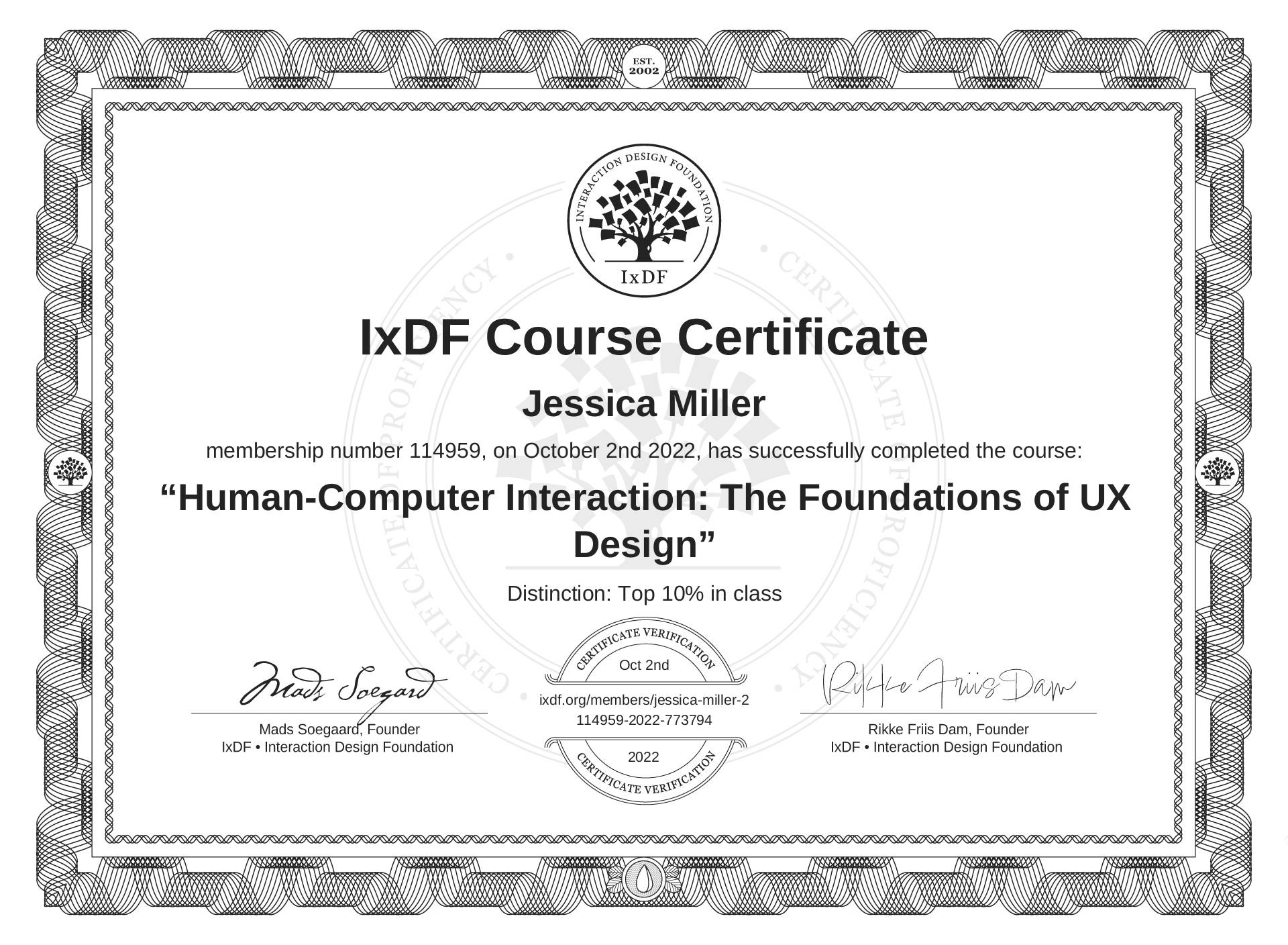 The IxDF Course Certificate (ID #3d3db5e8-8220-4726-8663-96654d03c1d8) above is awarded to Jessica Miller