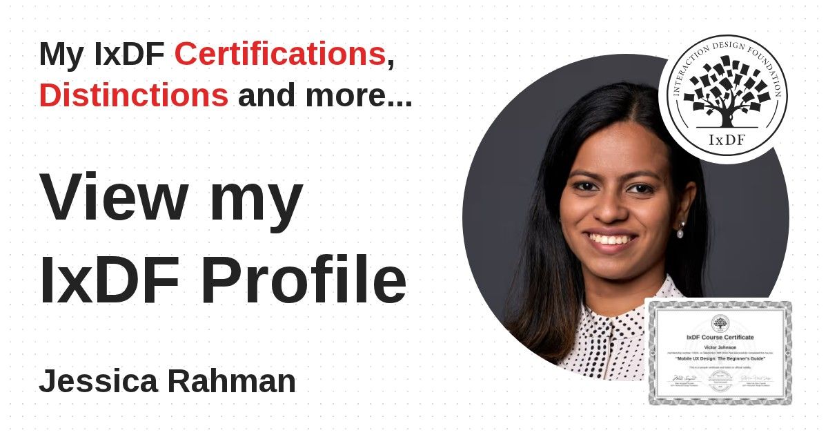 IxDF Course Certificates are awarded to Jessica Rahman in formal recognition of their coursework surpassing the rigorous benchmarks of exceptional performance established by the IxDF Educational Codex.