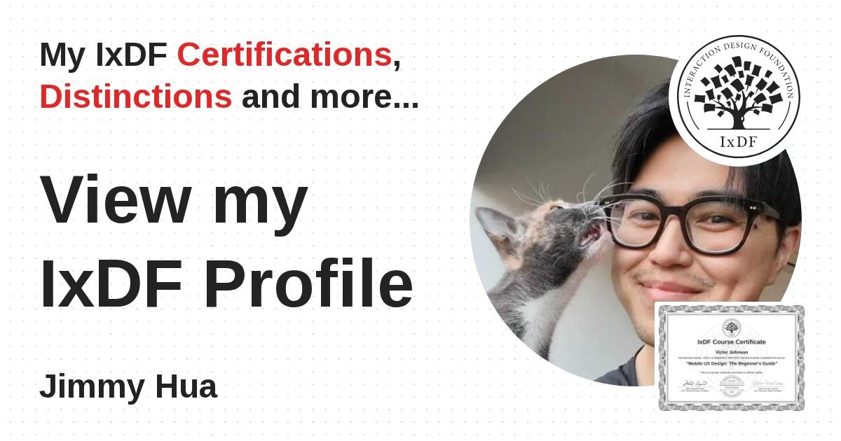 IxDF Course Certificates are awarded to Jimmy Hua in formal recognition of their coursework surpassing the rigorous benchmarks of exceptional performance established by the IxDF Educational Codex.