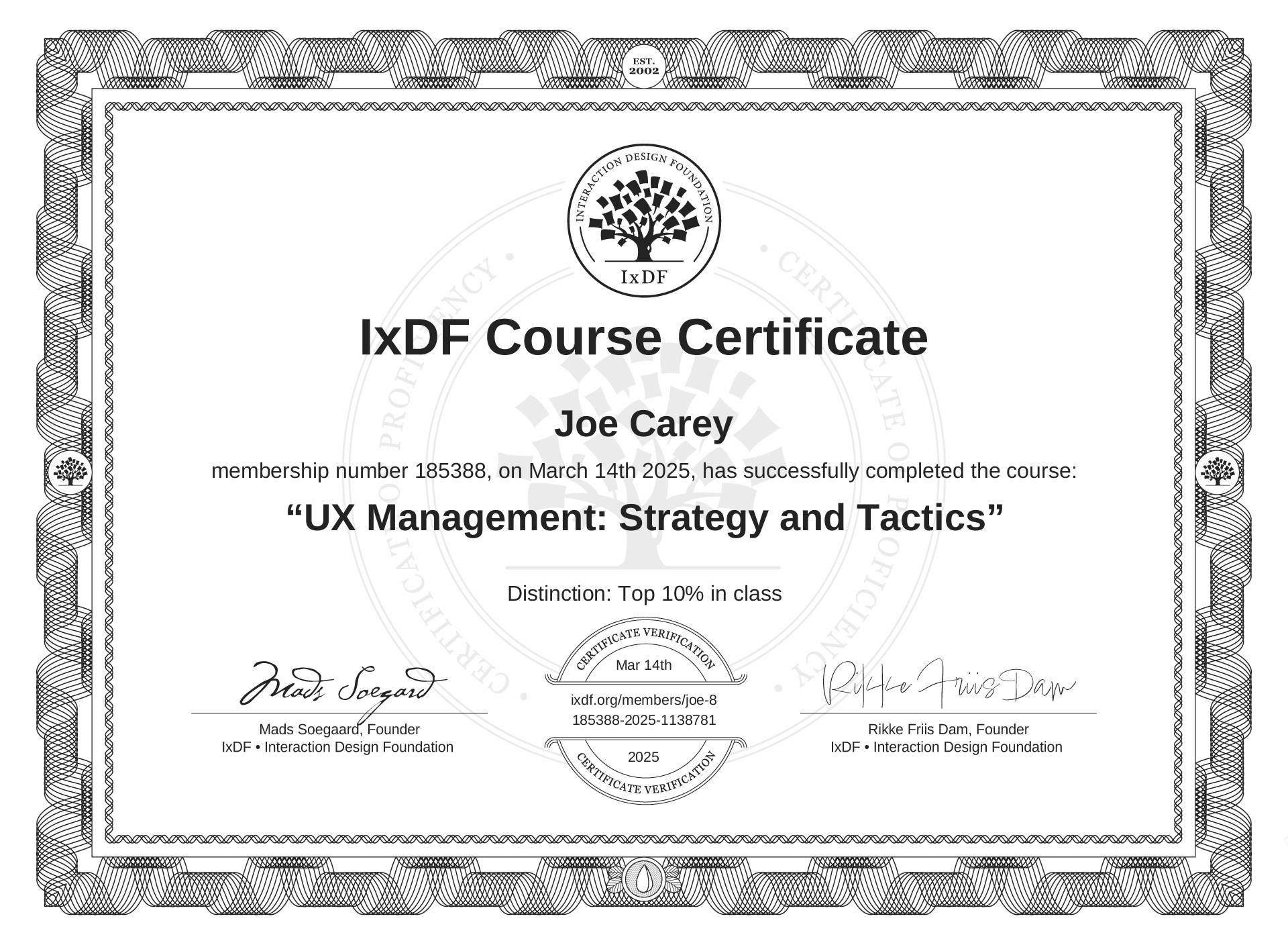 The IxDF Course Certificate (ID #5b22fa5d-0690-46db-9eec-8b59c4e3526e) above is awarded to Joe Carey with a Top 10% Distinction in formal recognition of their coursework surpassing the rigorous benchmarks of exceptional performance established by the IxDF Educational Codex. View Course Curriculum.