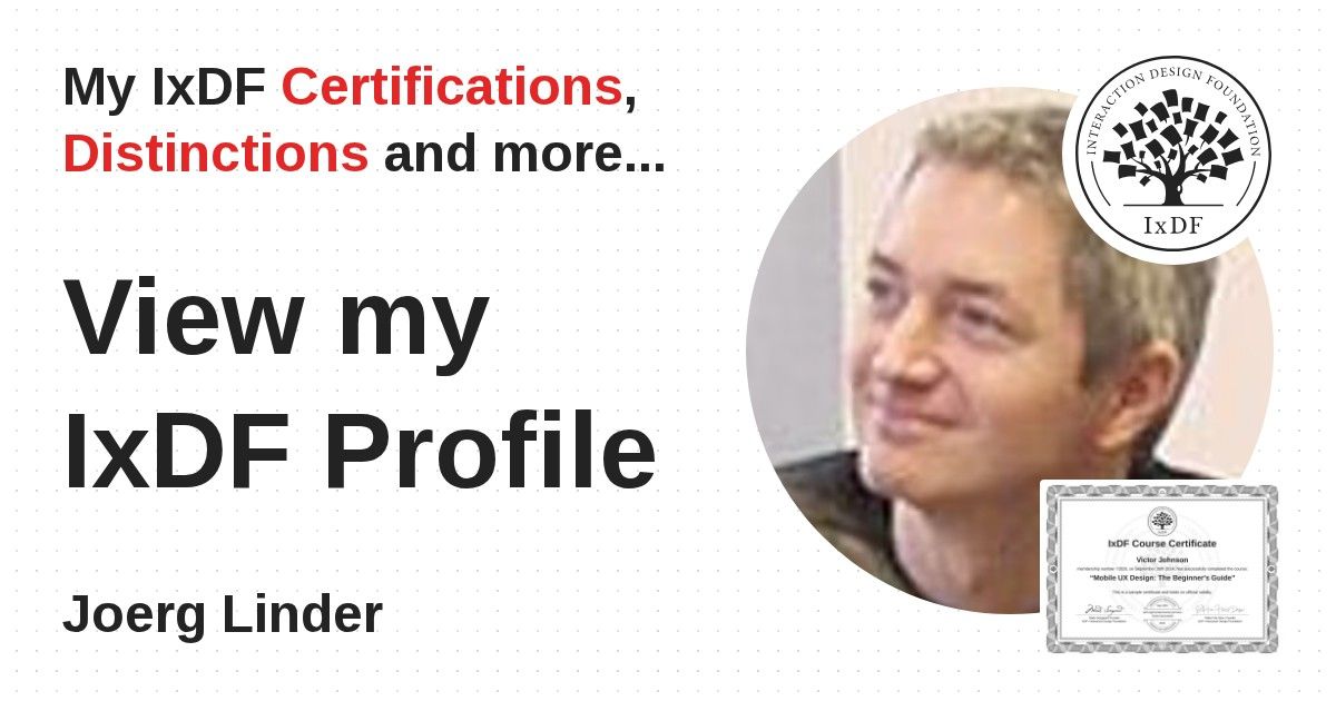 IxDF Course Certificates are awarded to Joerg Linder in formal recognition of their coursework surpassing the rigorous benchmarks of exceptional performance established by the IxDF Educational Codex.