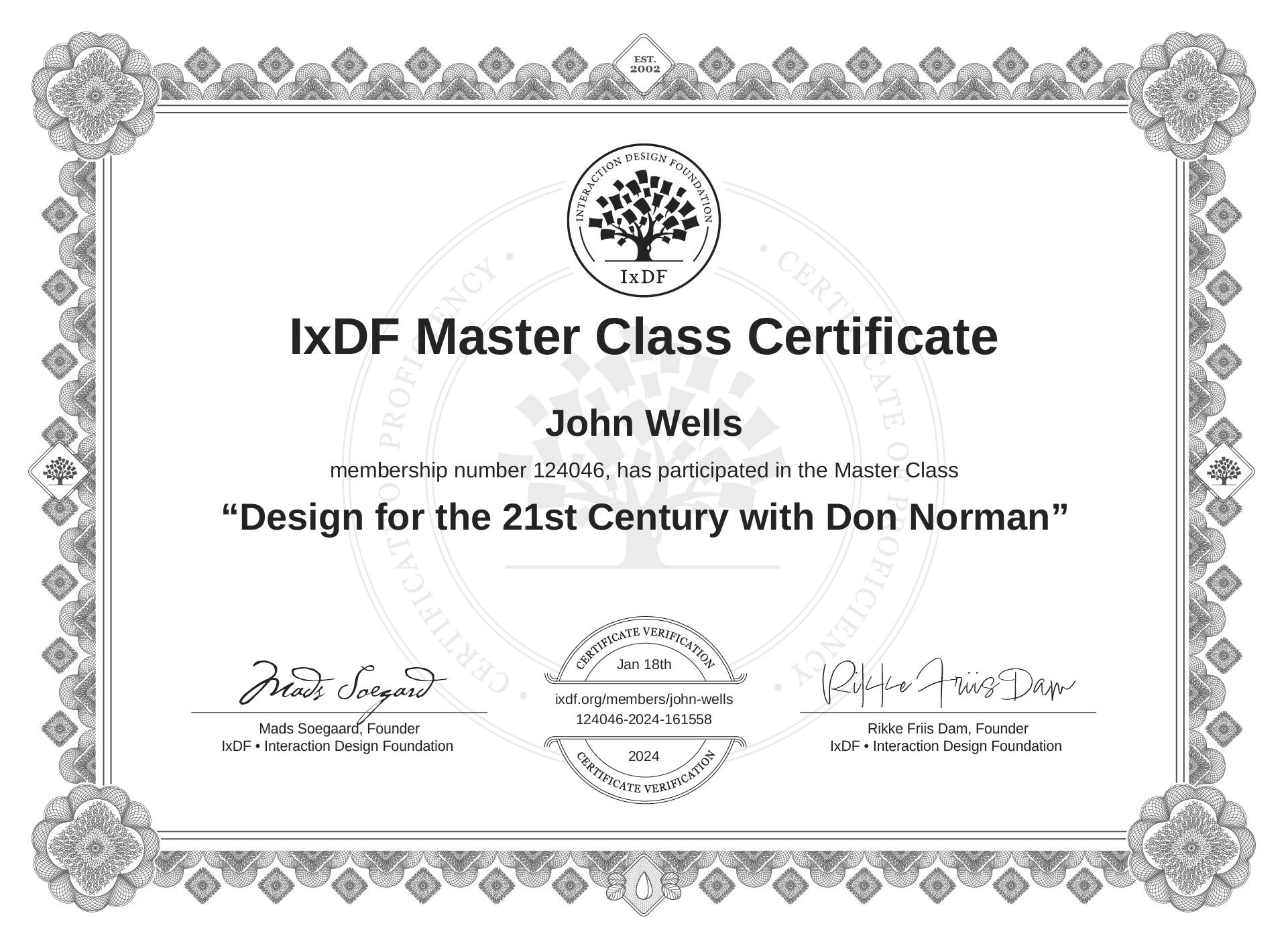 The IxDF Master Class Certificate (ID #mcc_04fdd478bc6646d0b2fdc0468d7decaa) above is awarded to John Wells in formal recognition of their participation in the Master Class Design for the 21st Century with Don Norman .