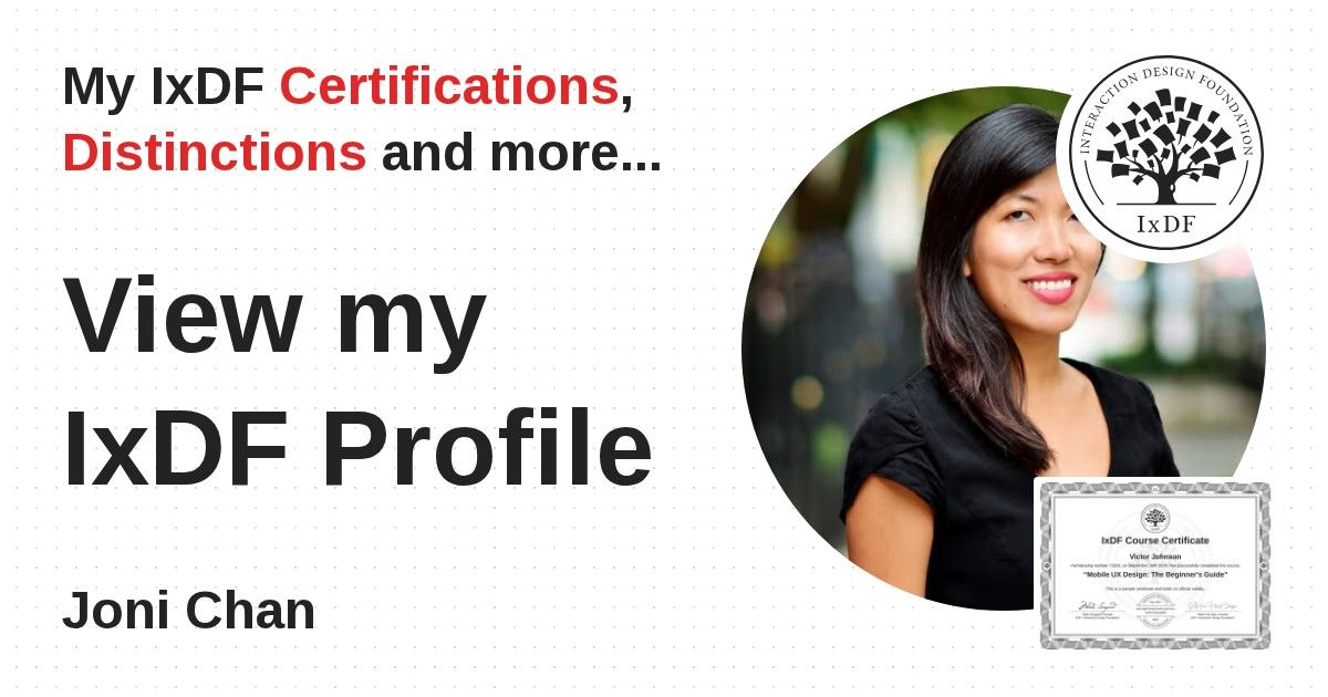IxDF Course Certificates are awarded to Joni Chan in formal recognition of their coursework surpassing the rigorous benchmarks of exceptional performance established by the IxDF Educational Codex.