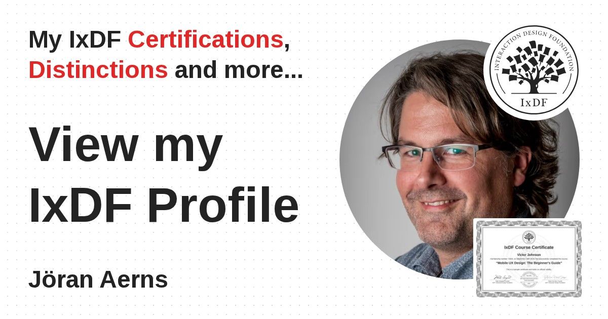 IxDF Course Certificates are awarded to Jöran Aerns in formal recognition of their coursework surpassing the rigorous benchmarks of exceptional performance established by the IxDF Educational Codex.