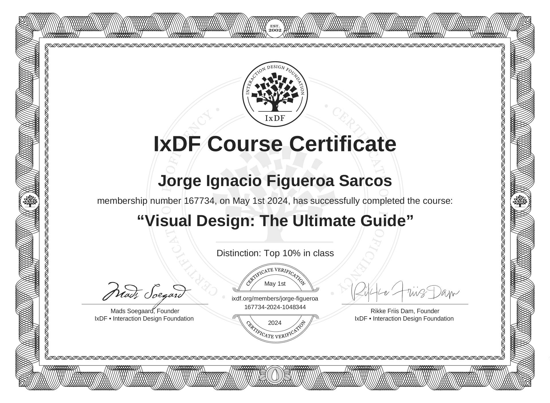 The IxDF Course Certificate (ID #f5af3539-b8be-4865-a613-79999ae78f8f) above is awarded to Jorge Ignacio Figueroa Sarcos with a Top 10% Distinction in formal recognition of their coursework surpassing the rigorous benchmarks of exceptional performance established by the IxDF Educational Codex. View Course Curriculum.