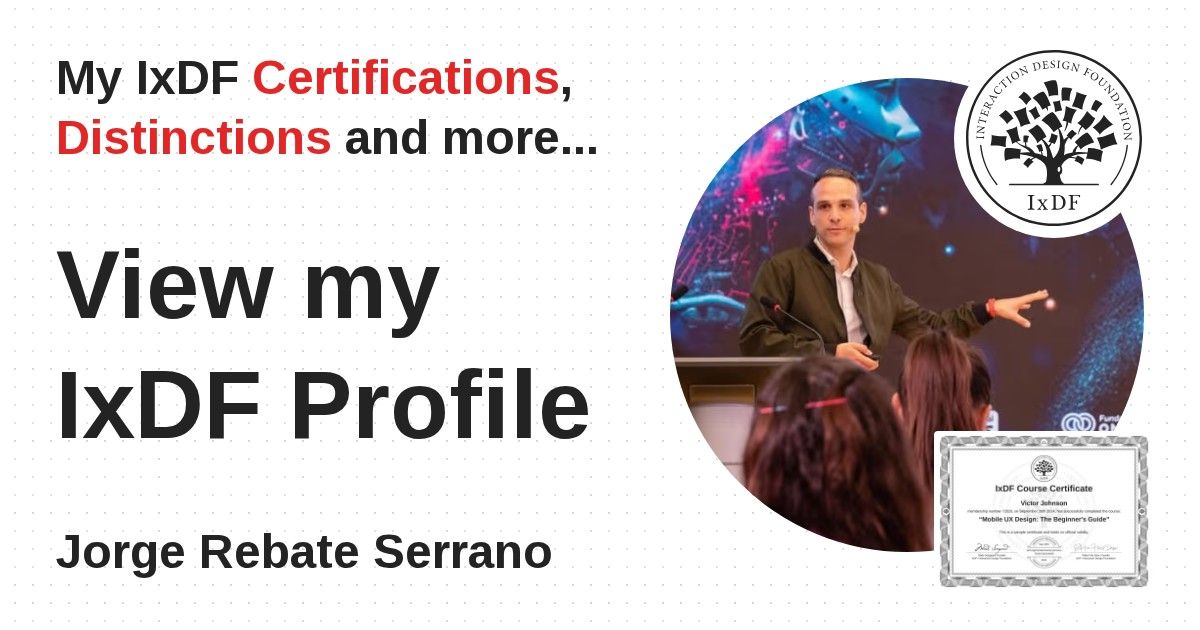 IxDF Course Certificates are awarded to Jorge Rebate Serrano in formal recognition of their coursework surpassing the rigorous benchmarks of exceptional performance established by the IxDF Educational Codex.