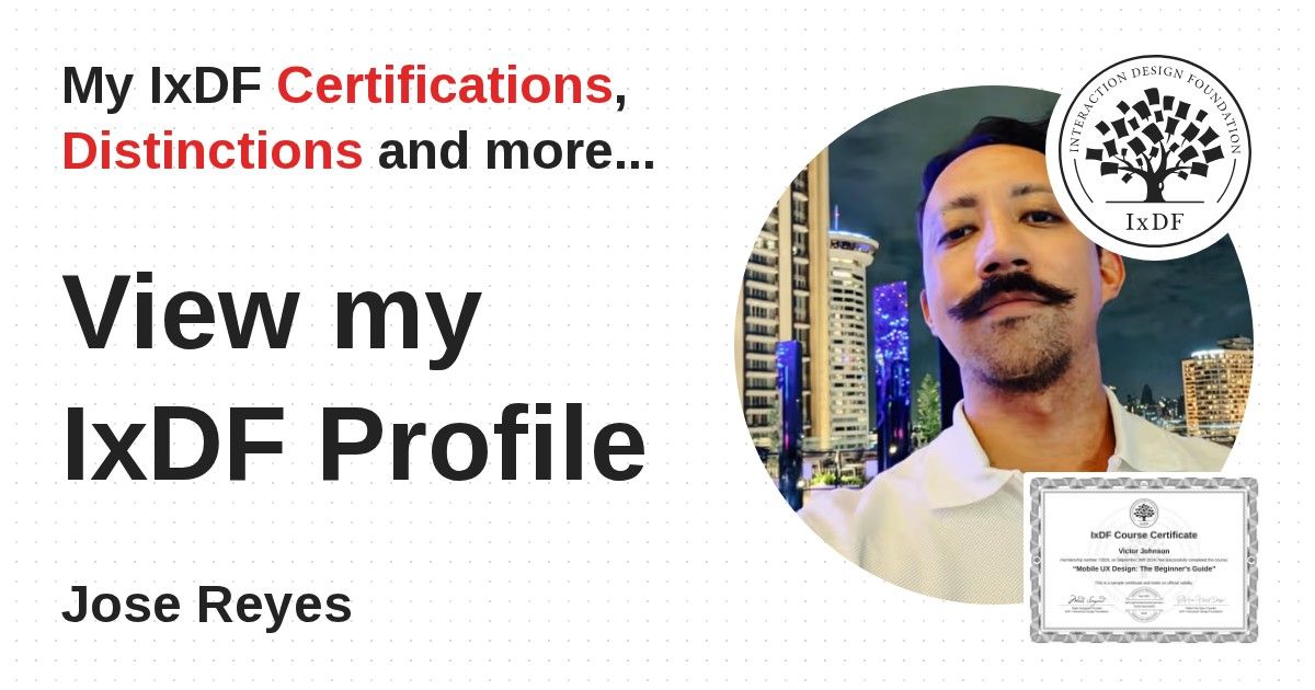 IxDF Course Certificates are awarded to Jose Reyes in formal recognition of their coursework surpassing the rigorous benchmarks of exceptional performance established by the IxDF Educational Codex.