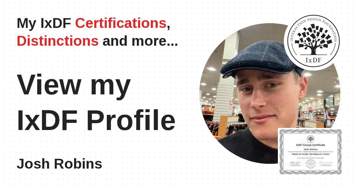 IxDF Course Certificates are awarded to Josh Robins in formal recognition of their coursework surpassing the rigorous benchmarks of exceptional performance established by the IxDF Educational Codex.